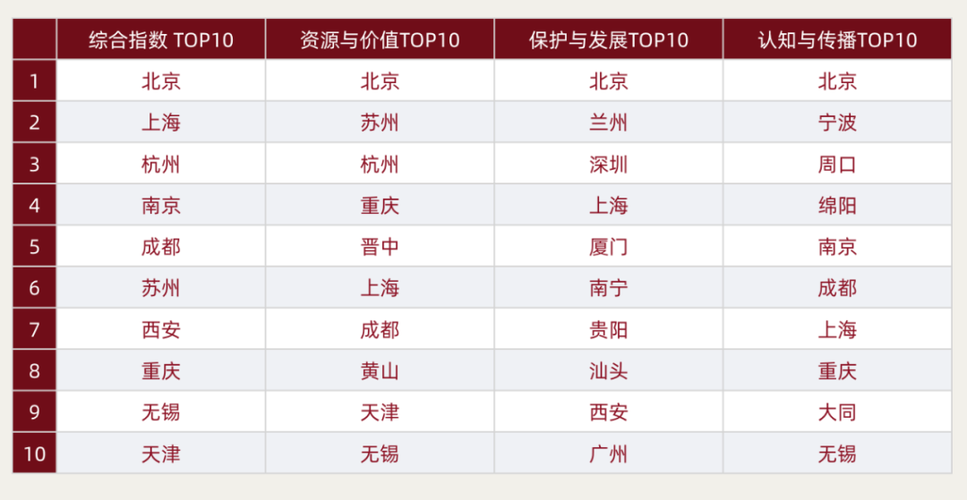 全国城市历史文化遗产保护利用综合指数排名 TOP10 城市