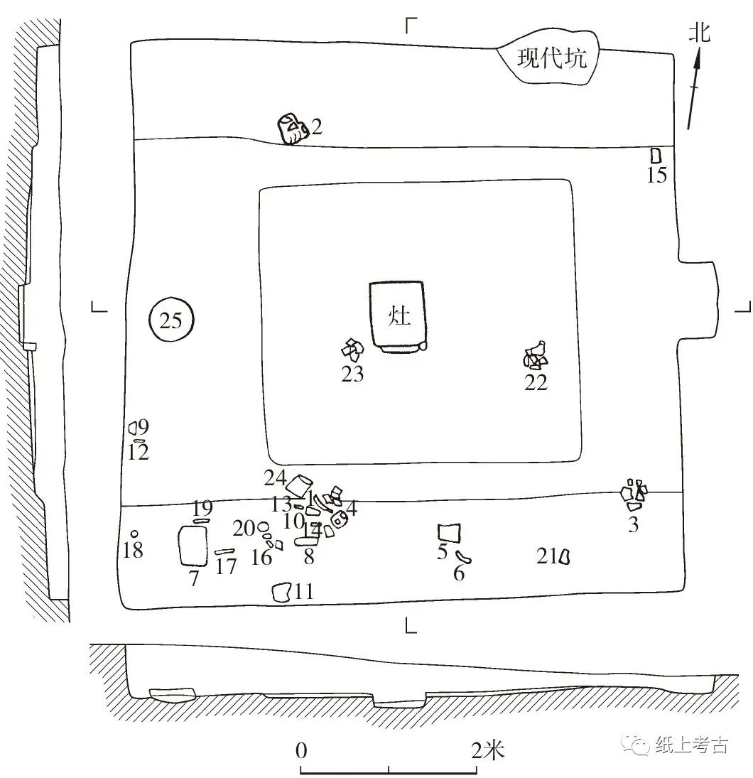 1. 骨匕 2~4、21~23. 陶筒形罐 5、9、10. 石铲 6. 鹿角 7、11. 石磨盘 8. 石磨棒 12. 骨针 13. 骨管 14、16. 石刀 15、24. 石板 17. 骨锥 18. 蚌器 19. 骨刀 20. 陶筒形罐底 25. 土台(据注释[2]图九一改绘)