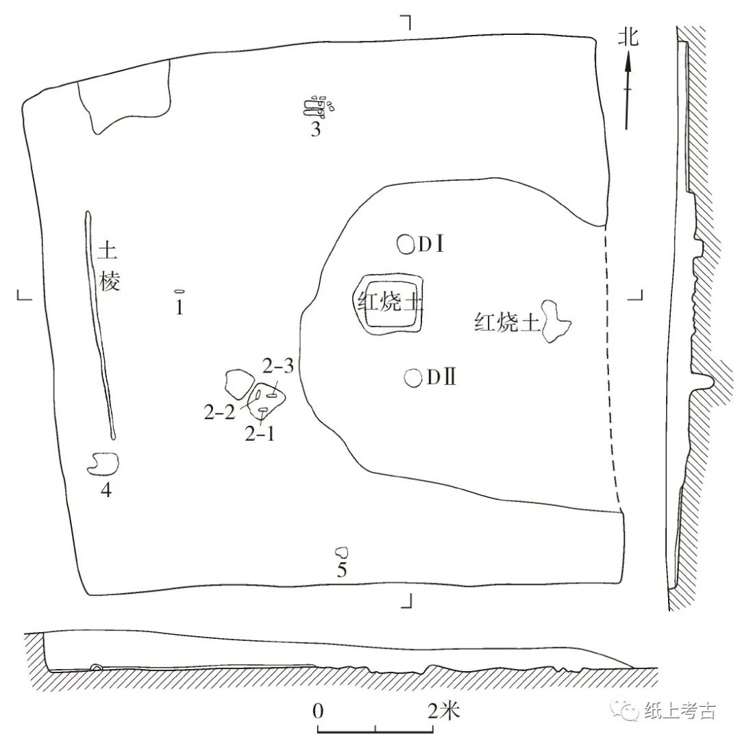 中心居住面的两侧生土原面大多左右对称,有些房屋在这个部位也发现有器物,但大多无遗物。值得注意的是,有2座房屋各在两侧和一侧靠穴壁预留有生土台,保留完整的BF61左右两侧(穴壁下)土台纵贯全房,高约0.05米(北)至0.1米(南),宽约1.1米(见图五);BF77仅残存西部,在南壁下有条形土台。看来两侧的位置应是睡卧空间。即便是最小的房屋,进深也有4米多,中等大小的房屋一般为5、6米,最大的AF12有8米(不包括BF68和AF13),两侧空间宽度一般在1米左右,小房屋一侧也能睡两人,大的可睡3人,两侧则有4~6人。不过两侧的空间并不一定都是用于睡卧,AF17等6座房屋的角落都各有一个窖穴,还有至少9座房屋(BF71、BF61、AF51、AF52、AF50、AF17、AF43、AF32、AF31)在里面两个屋角残留有器物,这样来看供睡卧的部位大致在两侧居中或再加上靠前的部位,这些位置睡满人的话,大致在4~5人之间。