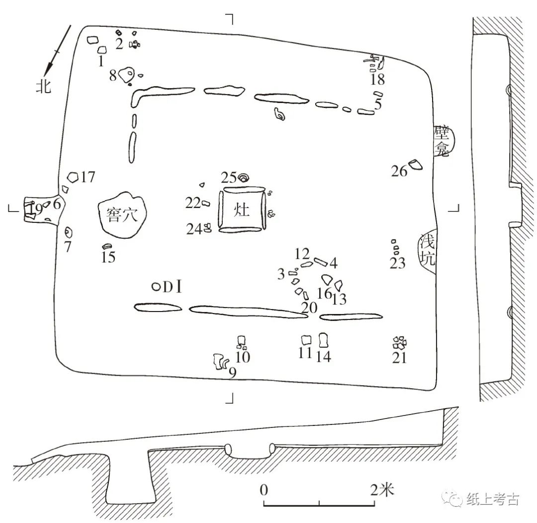 室内这四个空间中,进门后的一片生土居住面,宽度一般在1米以上,这里一般没有器物,但AF32门道和灶之间有一个袋形窖穴(见图六),上面原应有盖。AF9进门就有一块边长约1.1米的大石板,嵌入地面,下面不知是否有窖穴。这片地方难以开展固定的活动,可称为“门厅”。