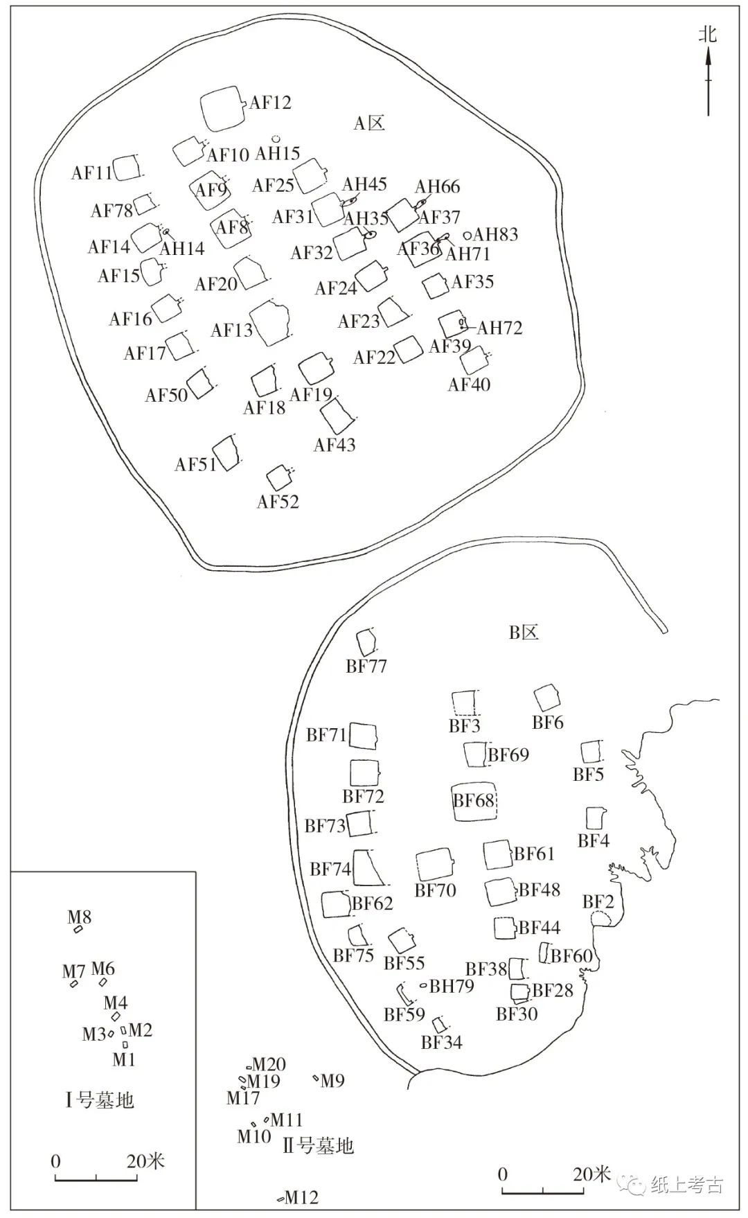 53座有灶的房屋大小悬殊,最小的BF28只有16平方米,最大的BF68则达100平方米,但以30~40平方米的房屋居多。在A区和B区两个环壕聚落中,虽然B区中的小房子多一点,但仅就面积来说差别并不是很大。大型房屋中,60~70平方米的有AF12和BF74两座,两区各一座;上百平方米的两区也各一座,即AF13、BF68。两区最大的差别是,A区房屋居住面经过修整有空间分割的占多数,全为生土原面的仅AF12、AF51两座,而B区半数以上为生土原面;A区有21座房屋的灶后部有马蹄形泥圈,而B区仅BF62一座,该房屋在最西边临近环壕,不属于成排的房屋,显然是后来加盖的,也就是说在两个环壕聚落最初规划形成的时候,B区并没有灶后部有马蹄形泥圈的房屋。