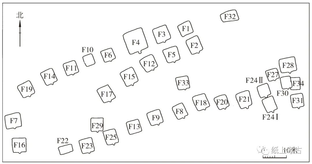 其中南台子遗址位于一处北高南低的坡地,东临西拉木伦河支流——碧流河。在发掘面积3100平方米的范围内,共清理33座兴隆洼文化的半地穴房址(图七),据称该聚落已经全部揭露。房屋所在的坡地向东突出,所有房屋的门向均朝南略偏东,也即朝向坡下。从平面图上看,房屋大致排成前、中、后三排,中后两排距离相对较近。其中后排房屋有F32、F1、F3、F4、F6、F10、F11、F14、F19等9座。中排有F2、F5、F12、F15、F17等5座,分布在中排之前和西边的F33、F29、F7、F16等4座房屋门向几乎朝南,与其他多数房屋的门向不一致,且F29与前排房屋F25几乎挨在一起,因此不可能是同时期的,甚至不像是后来增盖的。前排房屋明确的有F21、F20、F18、F8、F9、F13、F25、F23、F22等9座。F21以东还有7座房屋紧挨在一起,其中F24被报告认为是一间“吕”字形房屋,描述为前后两间,中间以窄门道相通。这样的房屋在兴隆洼文化中仅此一例,是十分不合理的,比如房屋顶部如何搭建就是一个问题,因此更像是有打破关系的两座普通房屋。另外根据F30打破F34的情况,证明这个位置的房屋不是一个时期的,因此,算上F24北边一座和F30(或F34)这两座与前排在一条线上的房屋,前排房屋的数量合计11座。这样,整个聚落同时存在的房屋就只有25座。即便还有后来增盖的房屋,总数也不会超过30座。这些房屋的面积大小相差不多,均在二十几到三十几平方米之间,但后排居中的F4特别大,有81.6平方米,这种房屋仅此一座。因此,不论从景观、规模还是聚落的结构来看,南台子聚落都与白音长汗两个环壕聚落中的一个基本一样。只是南台子房屋室内没有功能区划的线索,室内出土器物不少,但未发表具体的位置,难以进行进一步的分析。