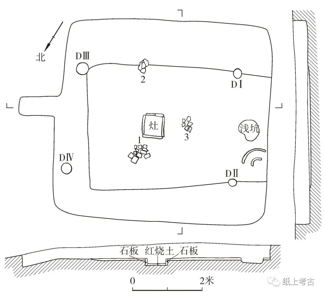54座房屋除AF15以外,房屋的平面均为方形或长方形。仅AF15平面形状大致为椭圆形,西壁内弧凹,南北间宽5.6、东西进深4.05米,无灶且居住面上未见遗物,应当不是住人的房子。AF15位于A区最西面一排AF14和AF16之间,从房屋间距来看,应是规划中就有的一个位置。保留有灶的房屋共46座,灶在房屋内大多居中或稍靠前。其中44座为平面呈方形的石板灶,灶的四壁贴立一周石板。还有BF5和BF70两座房屋为地面灶,只有烧土圈无灶坑,其中BF70位于B区两排房屋之间,是单独的一座房屋,BF5位于B区第一排中间,但面积很小,两座房屋居住面上仅有石块,无其他遗物。其他未保存灶的房屋都是因房屋中部已被破坏,从房屋结构来看原应有灶。因此,除AF15外的53座房屋应该都是居住用房。